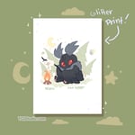 Mothman is an expert in summer relaxation! Cozy up by the fire and roast a marshmellow with him in this 5"x7" glitter print!