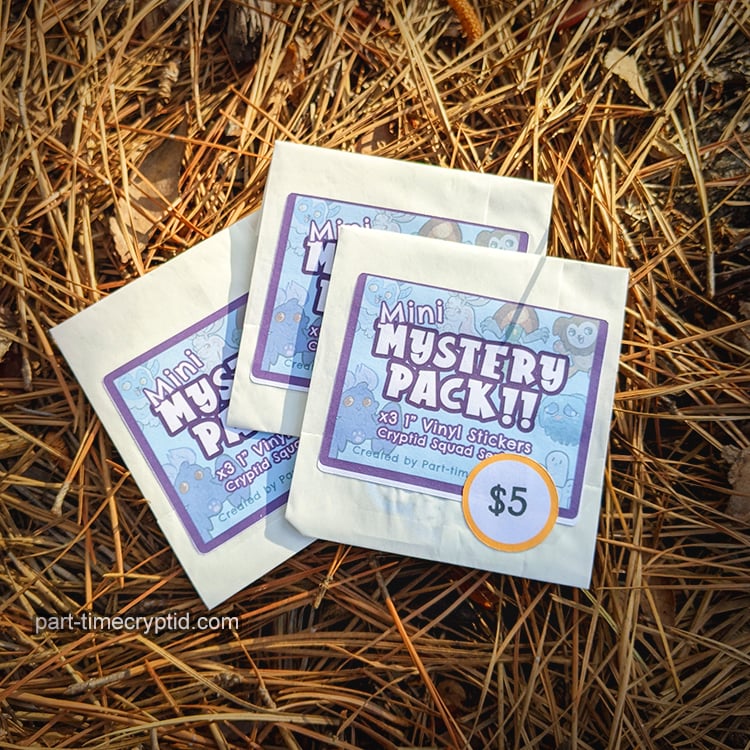 There are two sets available: Silent Hill (orange) & Cryptid Squad (blue). Each contain 3 stickers from those sets. You can see the full sets by checking out the sticker part of my shop, or looking at the second image in the set.